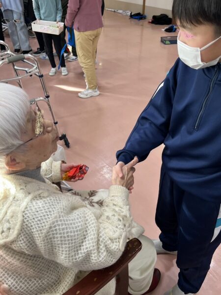 声を掛けながらプレゼントを渡す小学生の姿に